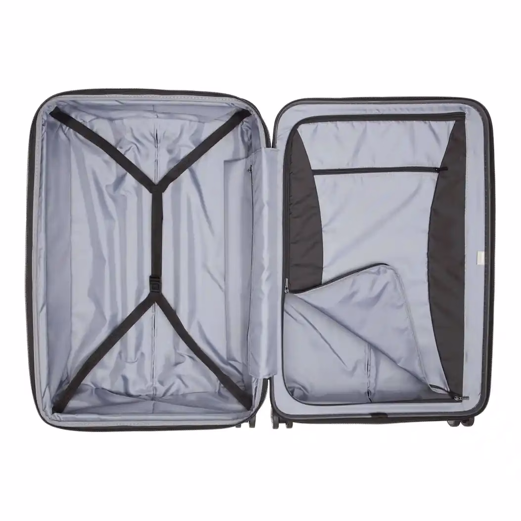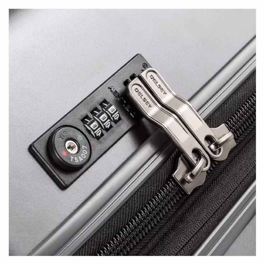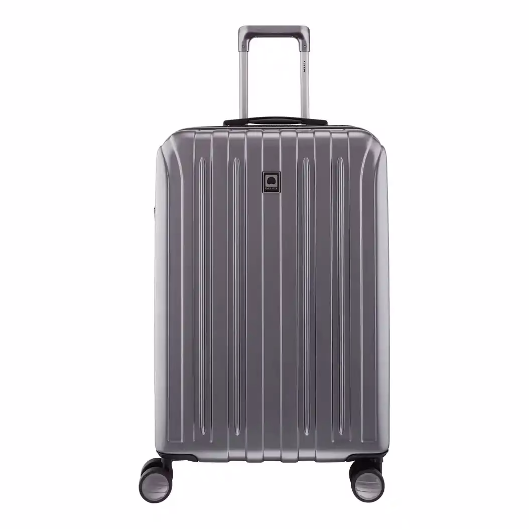 the Delsey TITANIUM Hard Trolley. Cabin luggage in Graphite. Sleek, durable, and lightweight with TSA lock. Ideal for work, school, or travel.