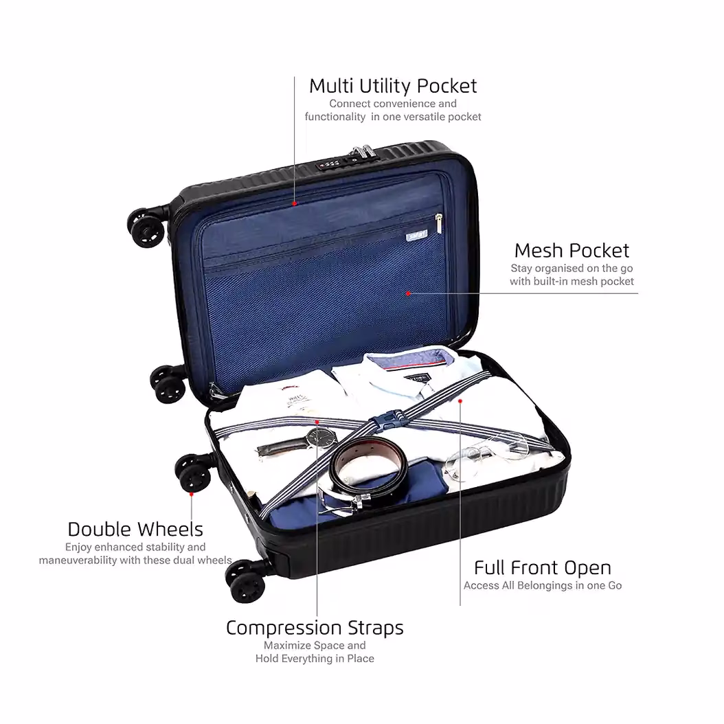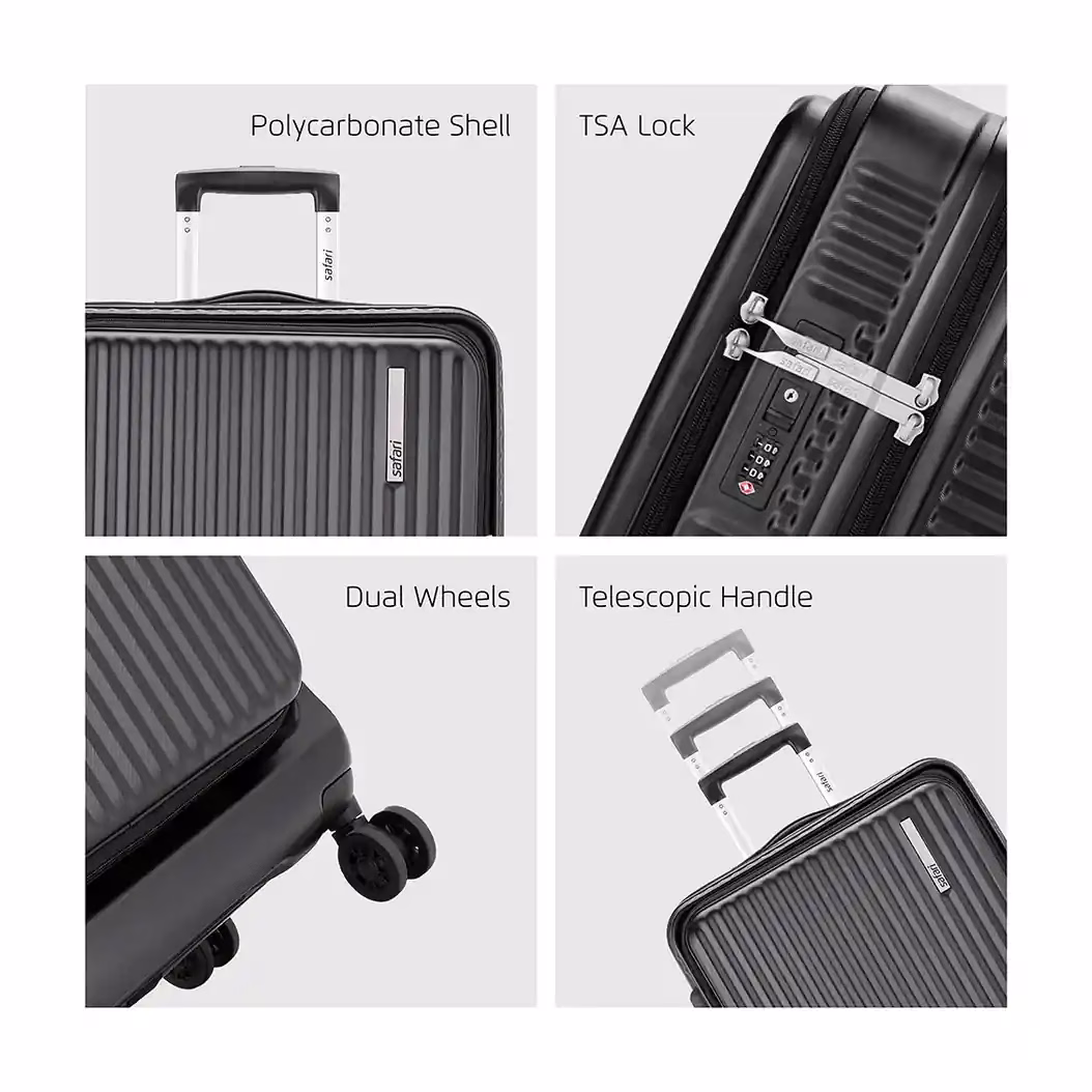 The Safari Recoil Front Opening Trolley Bag offers convenience and security. Its front-opening design ensures quick access to essentials, while the expander feature increases storage space. The L TSA lock and anti-theft zipper provide enhanced safety. Additionally, the dual wheels ensure smooth mobility. The lightweight build makes travel effortless, and the organised interiors keep belongings in place. Moreover, the telescopic handle adds to the ease of use, making this soft trolley bag a reliable choice.