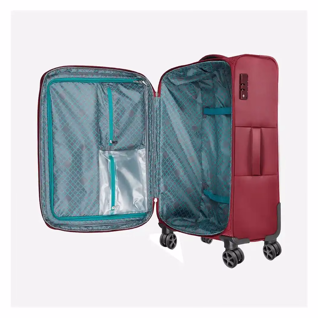 The Safari Slant Trolley Bag combines security, convenience, and durability. Its TSA lock and anti-theft zipper keep your belongings safe. The premium durable fabric ensures long-lasting use, while the expander feature provides extra space when needed. Additionally, the telescopic handle and 360-degree wheels allow effortless movement. The organised interiors and functional outside pocket make packing and access easy. This soft trolley bag is a perfect companion for stress-free travel.