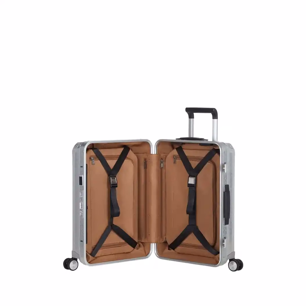 The BOSS x Lite-Box Alu™ premium trolley bag features integrated TSA-approved locks and a custom name tag, offering enhanced security and a personalized travel experience. Designed for modern travellers, its spacious interior includes adjustable packing straps, removable divider pads with utility pockets, and a soft-touch luxury lining. This hard shell aluminium luggage blends high durability with functional elegance, making it the ultimate choice for luxury travel bags.