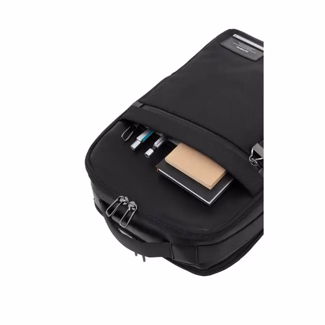 the Samsonite Vestor Backpack in black. Designed for professionals, it features a padded laptop compartment, multiple organizers, and a smart sleeve. Perfect for work, travel, or school.