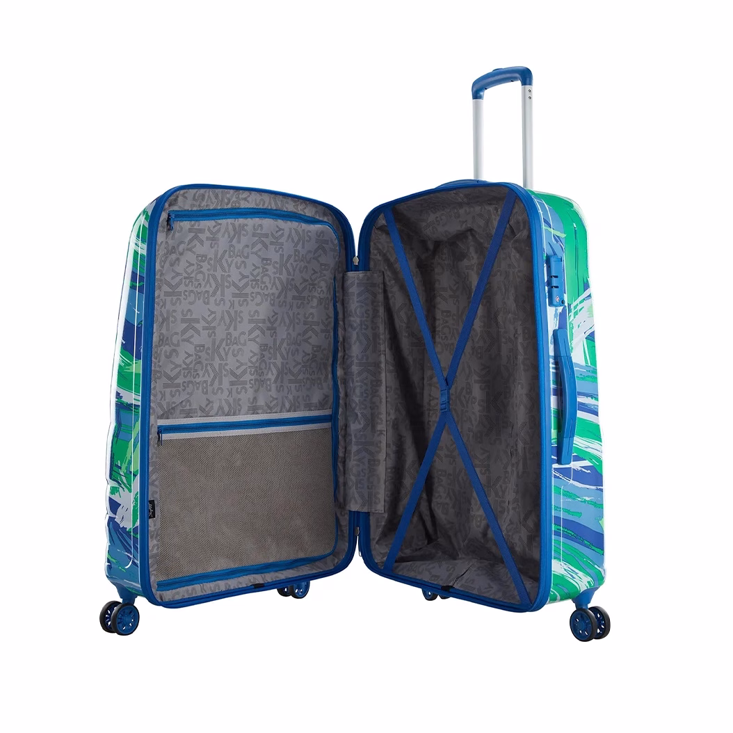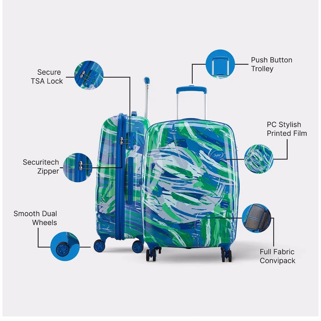 The Skybags ABSTRACT Hard Trolley-Luggage Online in India. Made from durable polycarbonate, this Skybags Abstract offers a TSA lock for added security. Moreover, it features 8 wheels for smooth mobility, ensuring a hassle-free journey. Its lightweight design and zipper closure make it convenient for travel. Whether as cabin luggage or a 360-degree rotation trolley suitcase, it combines both style and practicality. So, shop the best trolley bag at the best price!