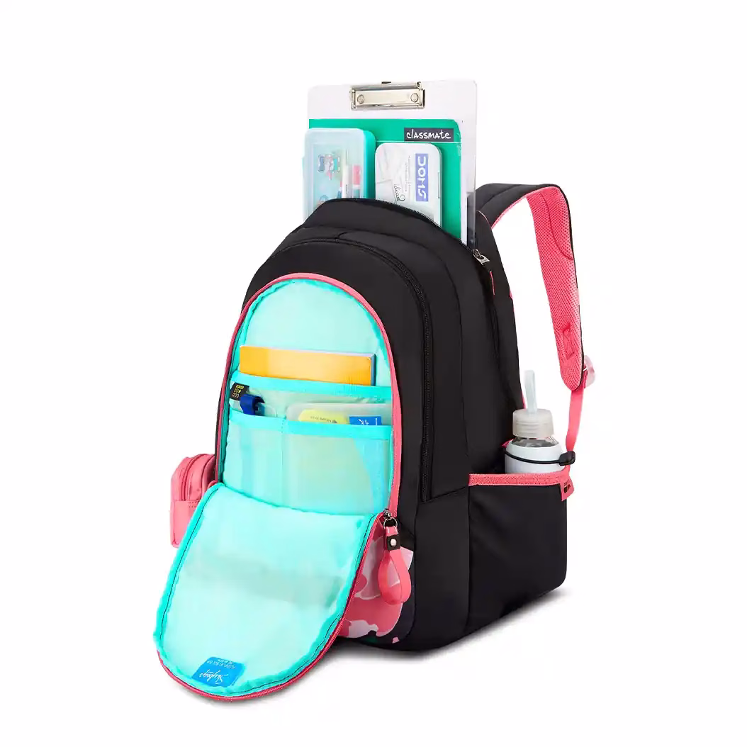 Moreover, the in-built raincover protects your belongings during unexpected showers. Stay organized with the quick access front pocket, organizer, and 2 side bottle pockets with loops. You can also carry it comfortably using the padded grab handle and air-mesh back panel. The built-to-last straps ensure durability, while the secret pocket and printed ID tag add convenience.