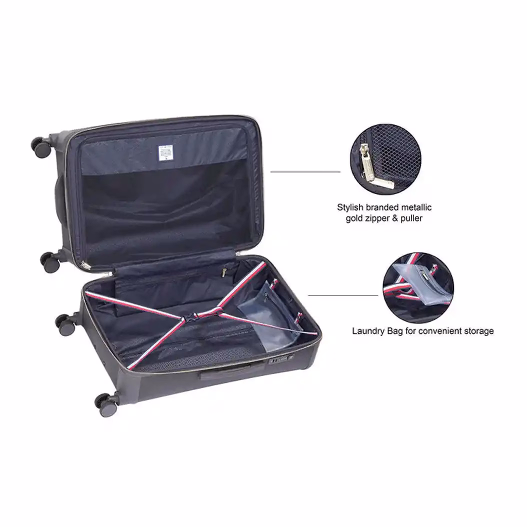 The Tommy Hilfiger Jazz Hybrid Luggage redefines luxury by blending robust polycarbonate with soft materials, ensuring both durability and elegance. Moreover, its golden zipper chain adds a glamorous touch, making it a true style statement. Designed for effortless travel, this lightweight luggage also features an innovative expander, allowing for extra space when needed. Additionally, its standout design not only enhances aesthetics but also reflects Tommy Hilfiger’s signature sophistication. Whether for business or leisure, the Jazz Luggage ensures you travel in style and comfort.