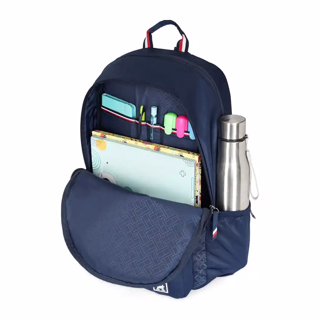 Own every day with the Tommy Hilfiger Mondrich Backpack. Its classic navy tone, interlocking print, and bold rubber logo add effortless style. Whether you’re heading to school, practice, or a weekend trip, this school backpack keeps you prepared. The breathable mesh back adds comfort, while water-resistant fabric and a rain cover protect your gear—rain or shine. Stay organized and ready for anything.